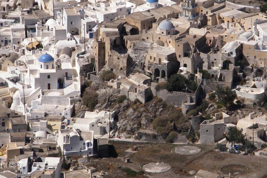 At a distance of 12 kilometres from Fira, Emporio, also known as Nimporio, is a quaint traditional settlement located on the southeast of Santorini. It is built on the foothills of Mount Prophet Elias and probably took its name from the fact that the village used to be the main commercial centre of Santorini for many centuries (emporio means trade in Greek). Nowadays, Emporio is a peaceful settlement, which has a strong medieval character and a wide range of interesting sights to visit. Well-preserved houses with flowered yards, charming little shops, narrow streets and white-washed alleys as well as beautiful arches and overhead bridges make this place really attractive. At the entrance of the village, there are two gorgeous blue domed churches, one of which is the chapel of Agios Nikolaos Marmaritis, an ancient sacred site made of marble, which is certainly worth visiting. But the most impressive attraction of Emporio is the medieval Kasteli, one of the five fortified castles of Santorini. Wandering around its ruins, you will be able to travel back in time and get a glimpse of the unique architecture of that era.